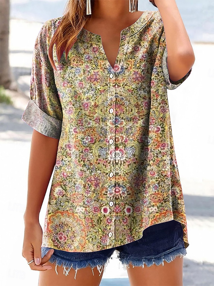Women's Vintage Ethnic Floral Art Printed Casual Short Sleeve Cotton and Linen Shirt