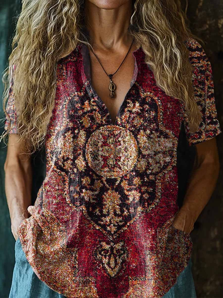 Women's Vintage Ethnic Style Tattoo Pattern Art Print Casual Short Sleeve Comfortable Cotton Shirt