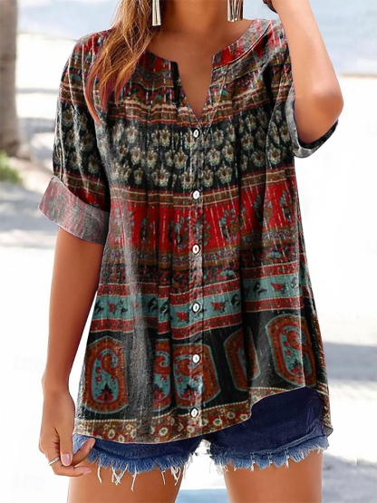 Women's Vintage Ethnic Style Tattoo Pattern Art Printed Cotton Linen Short Sleeve Shirt