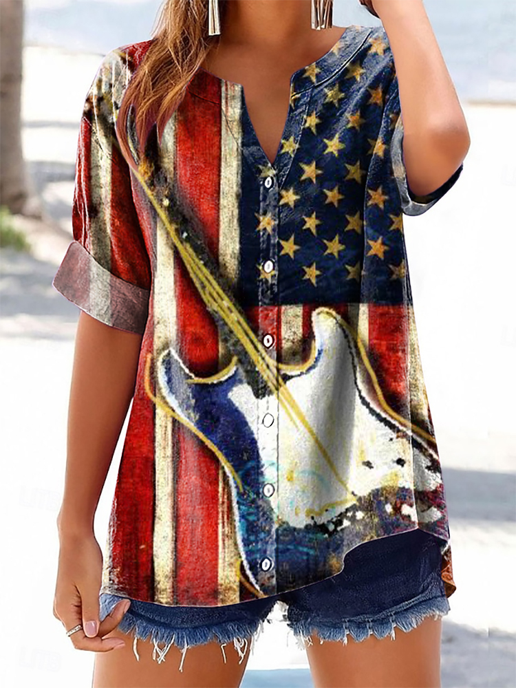 Women's Vintage Flag Guitar Art Print Casual Cotton And Linen Shirt