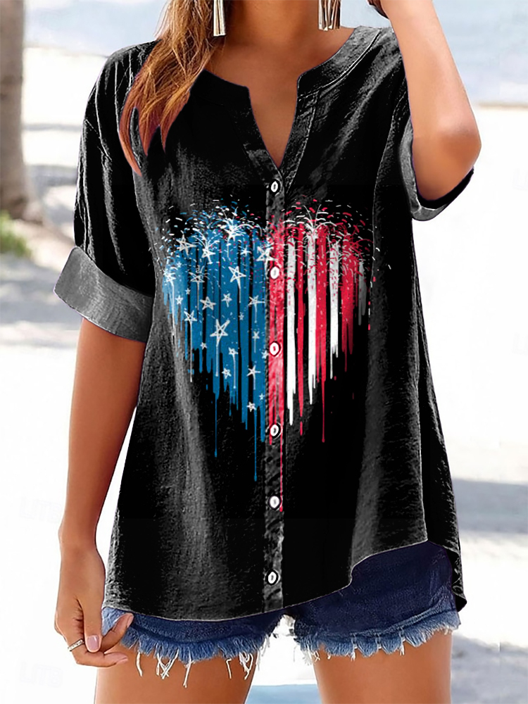 Women's Vintage Flag Love Art Print Casual Cotton And Linen Shirt