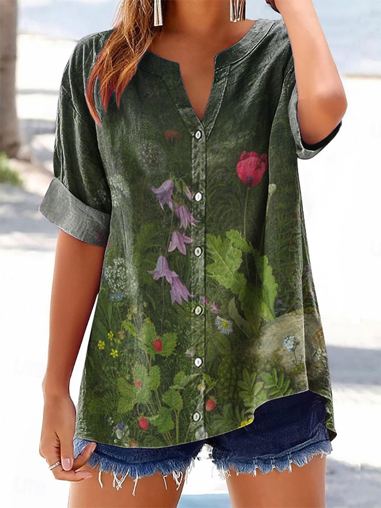 Women's Vintage Floral Art Pattern Art Print Casual Cotton And Linen Shirt