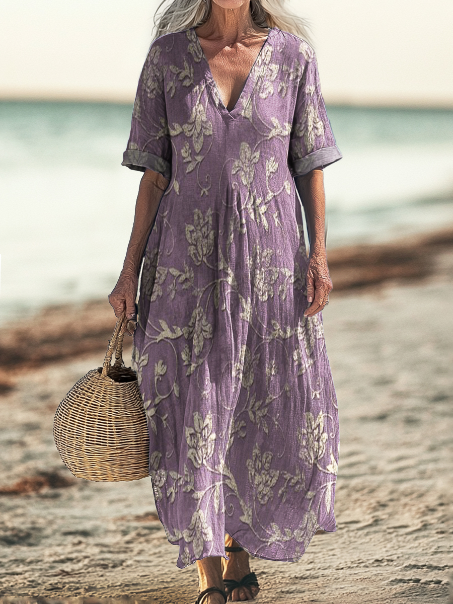 Women's Vintage Floral Art Pattern Print Pocket V-neck Cotton Dress