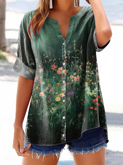 Women's Vintage Floral Art Print Casual Cotton And Linen Shirt