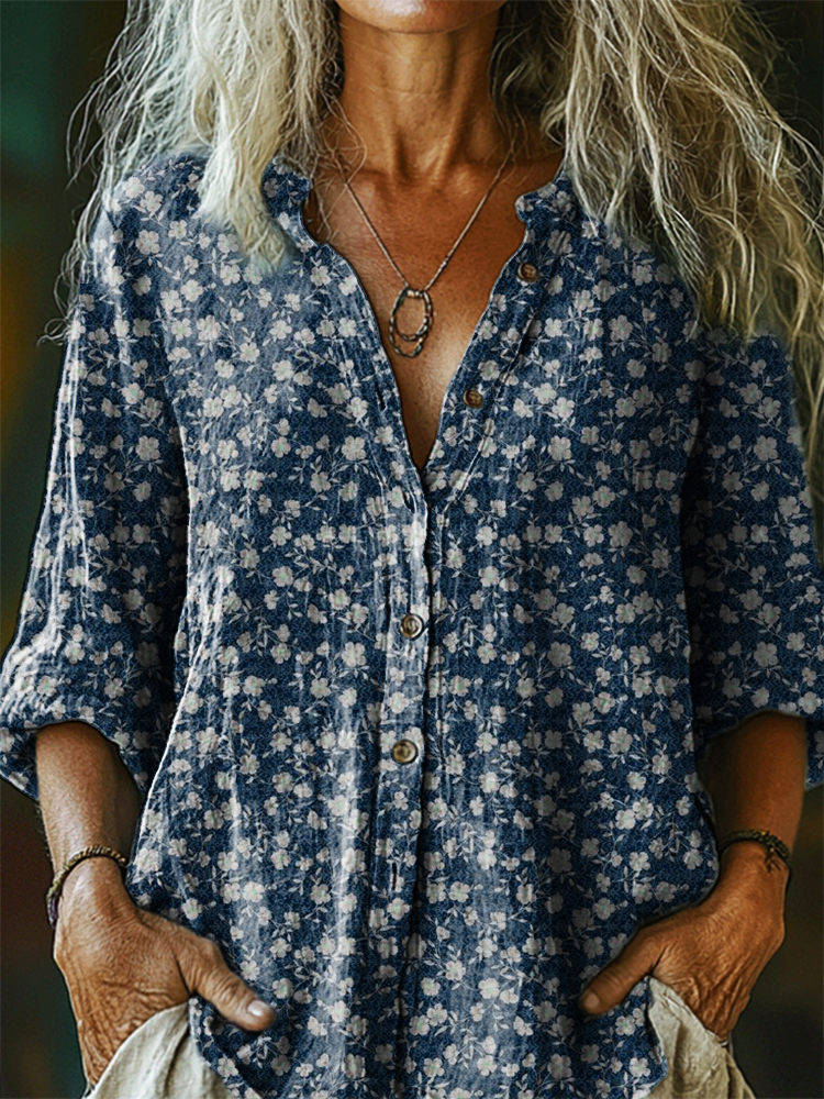 Women's Vintage Floral Art Print Casual Cotton And Linen Shirt