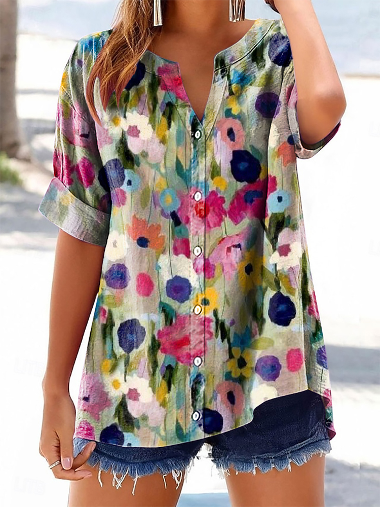 Women's Vintage Floral Art Print Casual Cotton And Linen Shirt