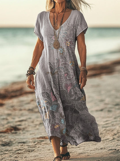 Women's Vintage Floral Art Print Pocket Cotton Dress