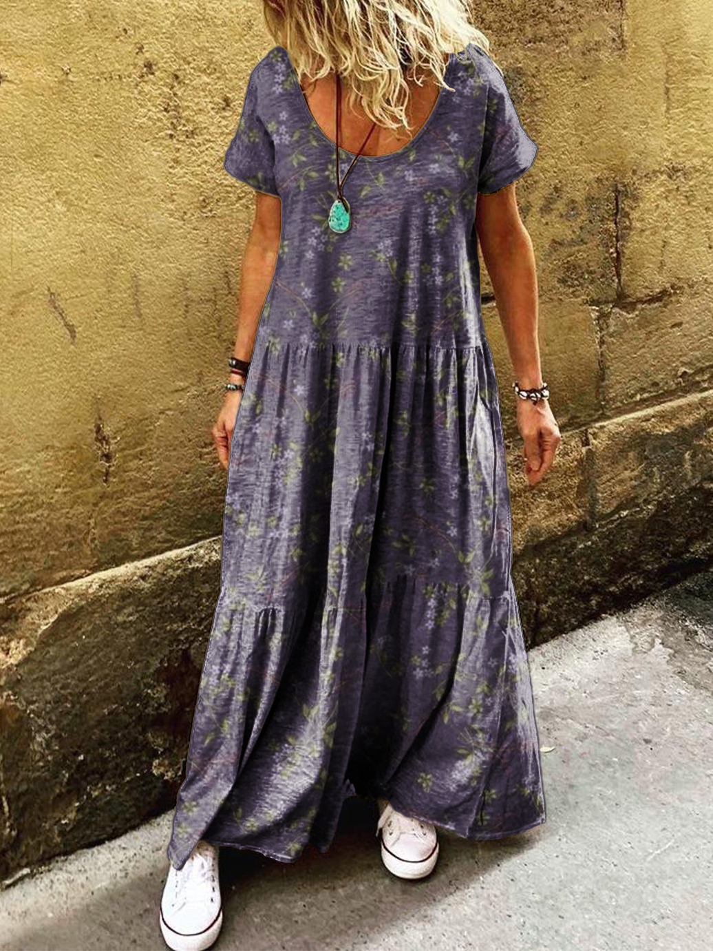 Women's Vintage Floral Art Print Pocket Short Sleeve Cotton Dress