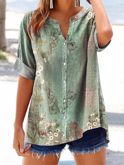 Women's Vintage Floral Art Print Short Sleeve Cotton and Linen Shirt