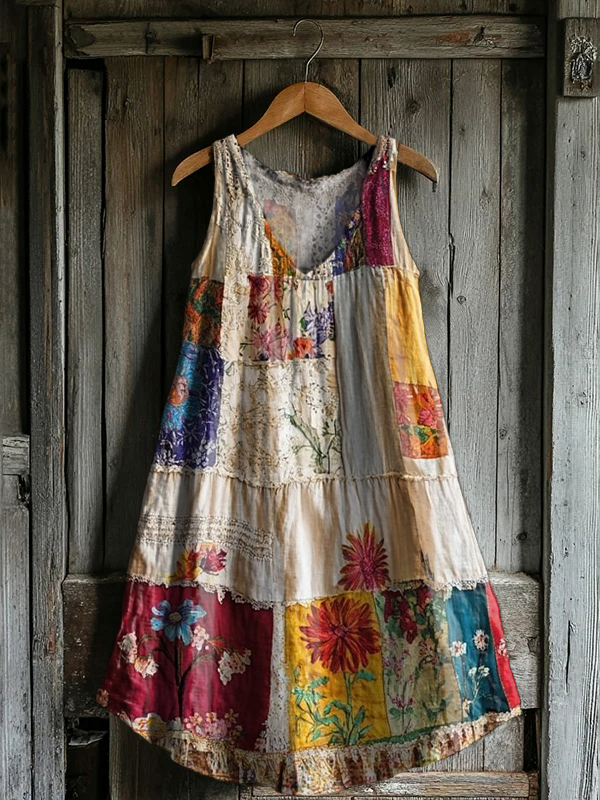 Women's Vintage Floral Collage Art Print V-neck Pocket Cotton Dress