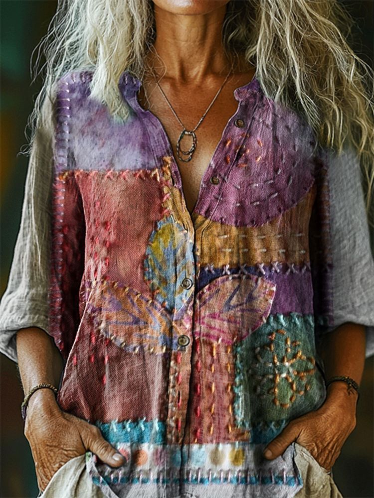 Women's Vintage Floral Patchwork Pattern Art Print Casual Cotton Linen Shirt