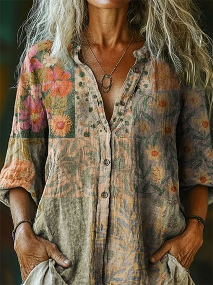 Women's Vintage Floral Patchwork Pattern Art Print Casual Cotton Linen Shirt