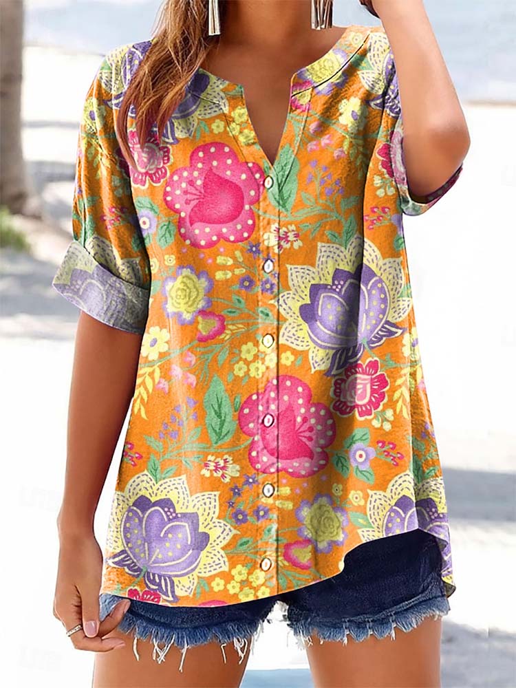 Women's Vintage Floral Pattern Art Print Casual Cotton Linen Shirt