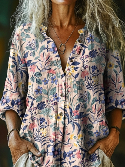 Women's Vintage Floral Tattoo Pattern Art Print Linen Cotton Casual Shirt