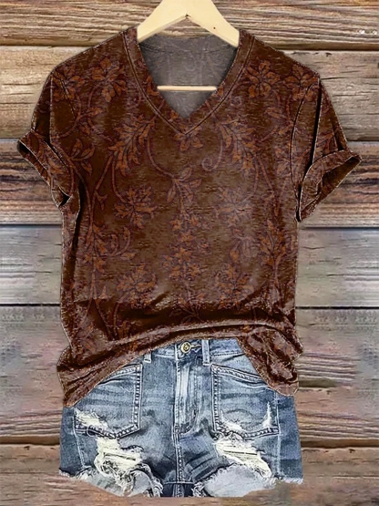 Women's Vintage Folk Flowers Print V-neck Casual T-Shirt