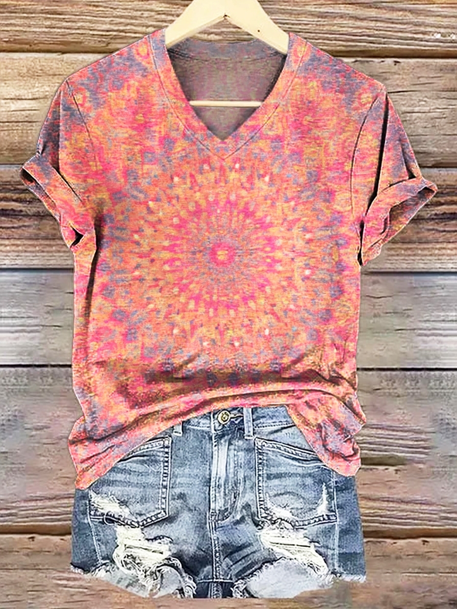 Women's Vintage Kaleidoscope Art Pattern Print Casual V-neck T-shirt