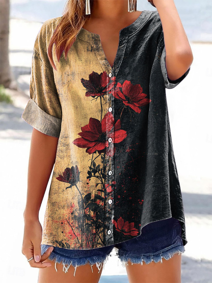 Women's Vintage Rose Floral Art Print Casual Cotton And Linen Shirt