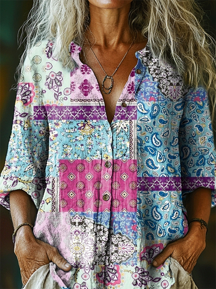 Women's Vintage Tattoo Pattern Art Print Casual Cotton Linen Shirt