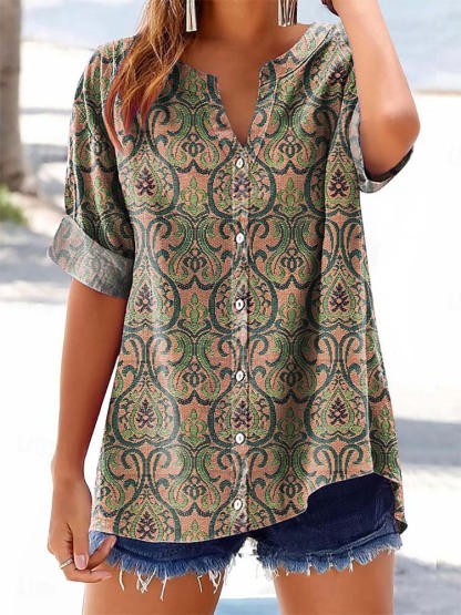 Women's Vintage Tattoo Pattern Art Print Casual Cotton Linen Shirt