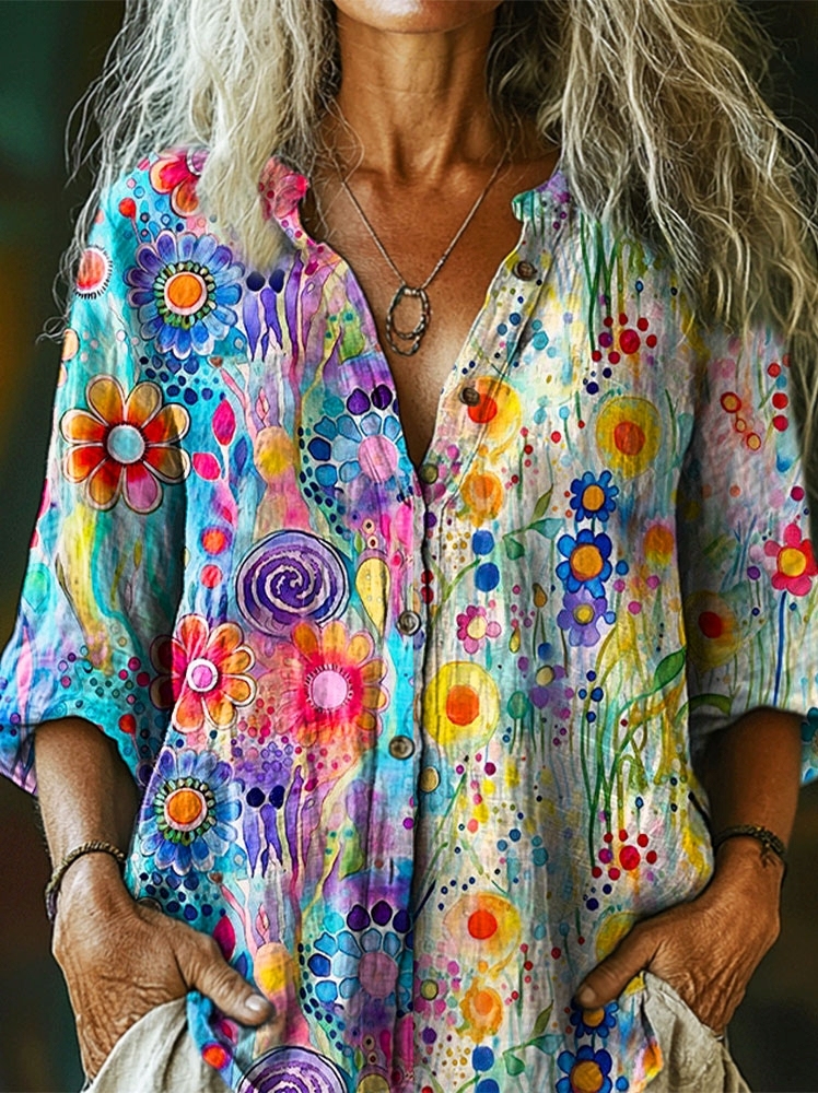 Women's Watercolor Floral Art Pattern Print Casual Cotton Linen Shirt