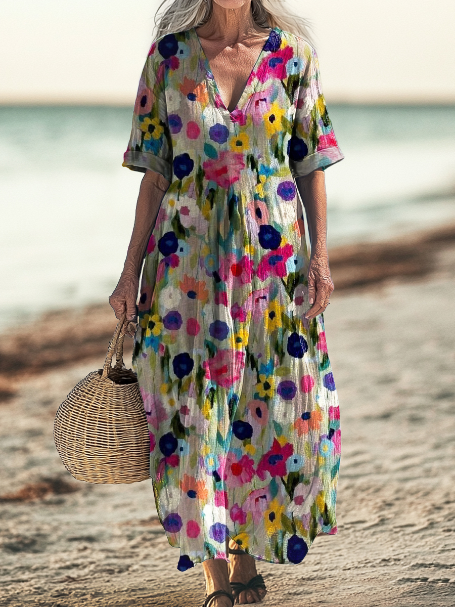 Women's Watercolor Floral Art Print Pocket V-neck Cotton Dress