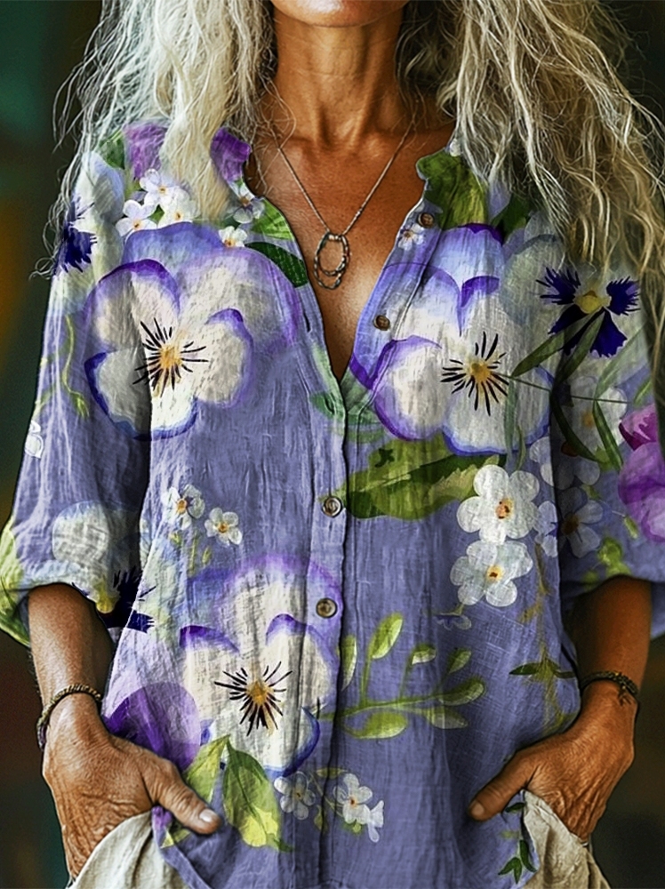 Women's Watercolor Flower Art Print Casual Cotton Linen Shirt
